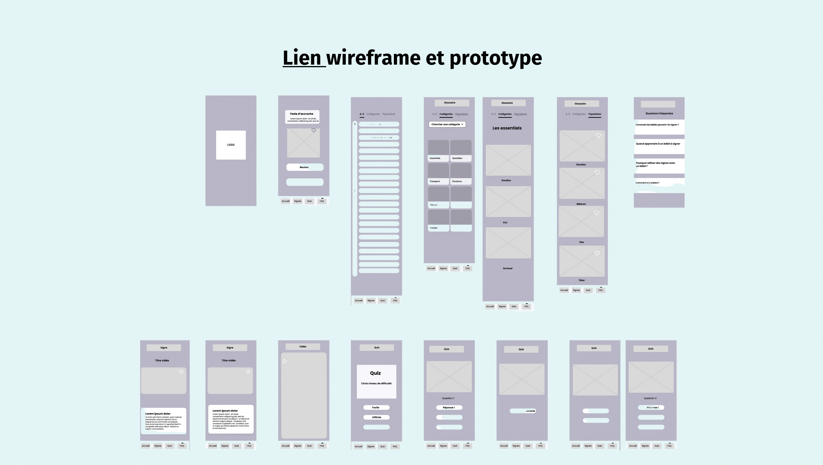 Le wireframe est le brouillon qui permet de décrire les différentes étapes et les pages principales d el’application ici.Conçu sur Figma, il permet de schématiser les principales fonctionnalités et la présentation de celle-ci ainsi que le smécanisme à actionner.